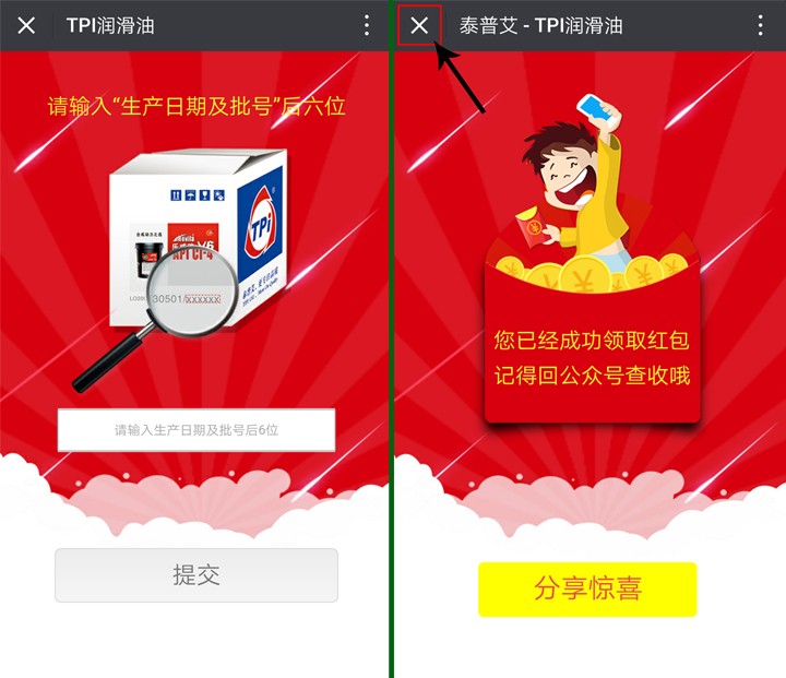 6.進入紅包提示頁面后,關(guān)閉活動界面,返回泰普艾潤滑油官方微信