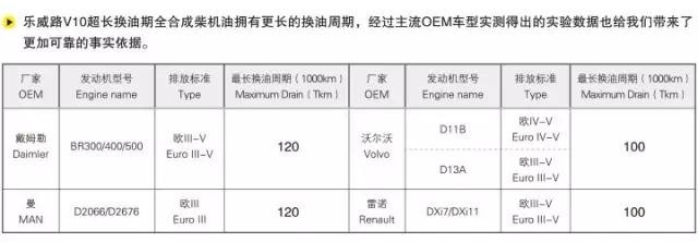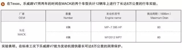 在美國德克薩斯州,樂威路V7用兩年時間在“馬克(MACK)”兩個車型的12輛車上進行了長達8萬公里的行車實驗,證明了在標準工況下樂威路V7可達70000KM的超長換油周期,是混合車隊的理想選擇。