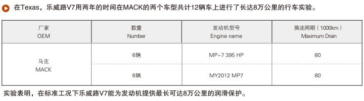 在美國(guó)德克薩斯州,樂威路V7用兩年時(shí)間在“馬克(MACK)”兩個(gè)車型的12輛車上進(jìn)行了長(zhǎng)達(dá)8萬公里的行車實(shí)驗(yàn),證明了在標(biāo)準(zhǔn)工況下樂威路V7 可達(dá)70000KM的超長(zhǎng)換油周期,是混合車隊(duì)的理想選擇。