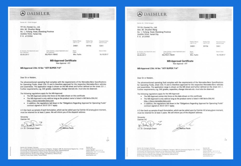 自動變速箱油是一類細(xì)分的傳動類潤滑油,變速箱油的種類繁多,需求量小,變速箱廠家和汽車品牌廠家只開發(fā)針對自己箱型和車型的油品,因此變速箱油沒有全球統(tǒng)一的標(biāo)準(zhǔn),最權(quán)威的是各主要OEM廠商的標(biāo)準(zhǔn)。泰普艾擁有奔馳、通用等德系、美系的多個變速箱油認(rèn)證和認(rèn)可,是國內(nèi)為數(shù)不多的同時擁有美歐主流認(rèn)證的變速箱油品牌,并持有多項自動變速箱油發(fā)明專利!